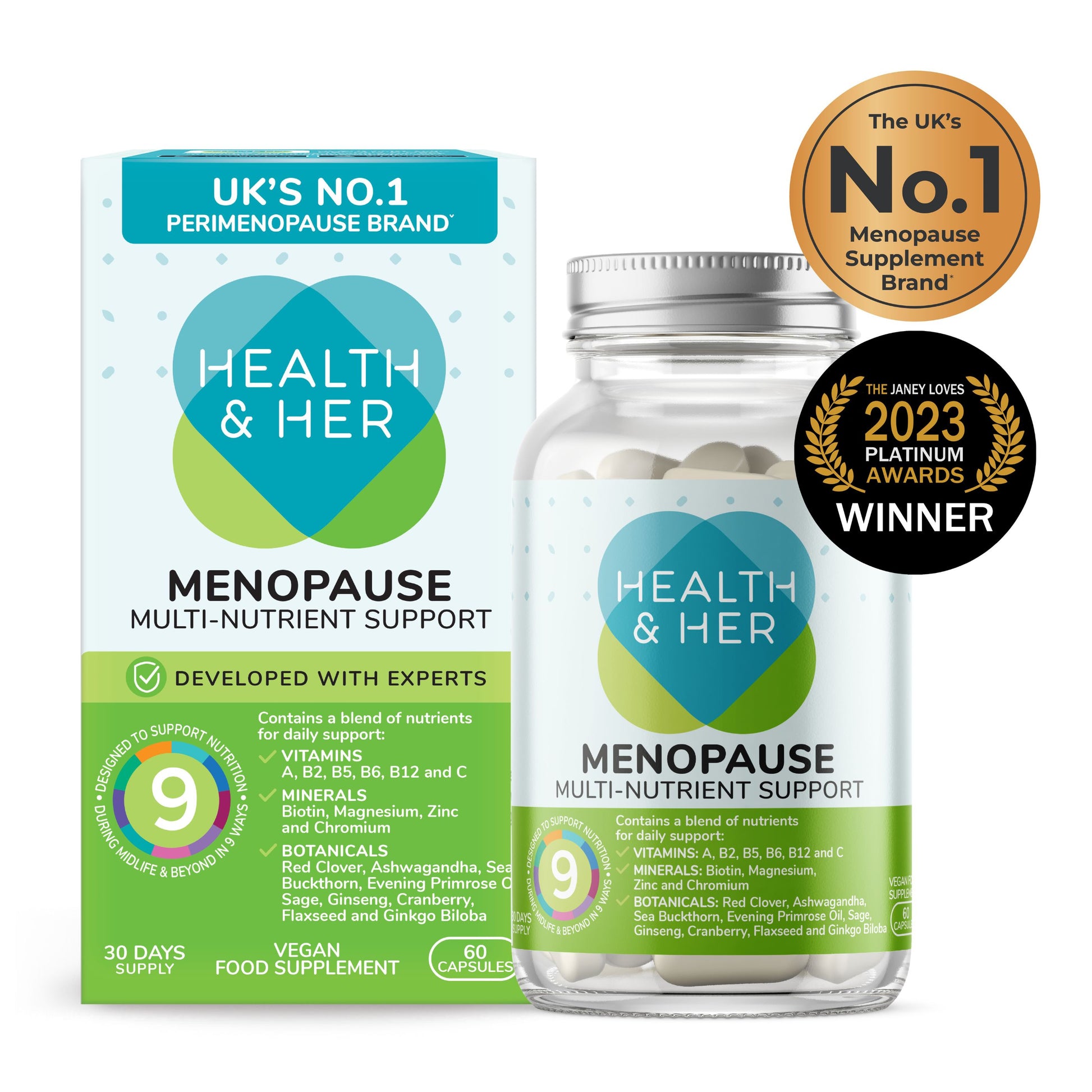 Bei Health & Her steht Frauengesundheit im Mittelpunkt. Aus diesem Grund haben wir umfangreiche Untersuchungen mit Tausenden von Frauen durchgeführt, um herauszufinden, wie wir sie in den Wechseljahren am besten unterstützen können. Entwickelt von Expertinnen, enthält der Health & Her Wirkstoff-Komplex eine Mischung aus hochwertigen Vitaminen, Mineralien und pflanzlichen Wirkstoffen und bietet Frauen eine praktische Quelle für natürliches Phytoöstrogen und hormonausgleichendes Vitamin B6.
